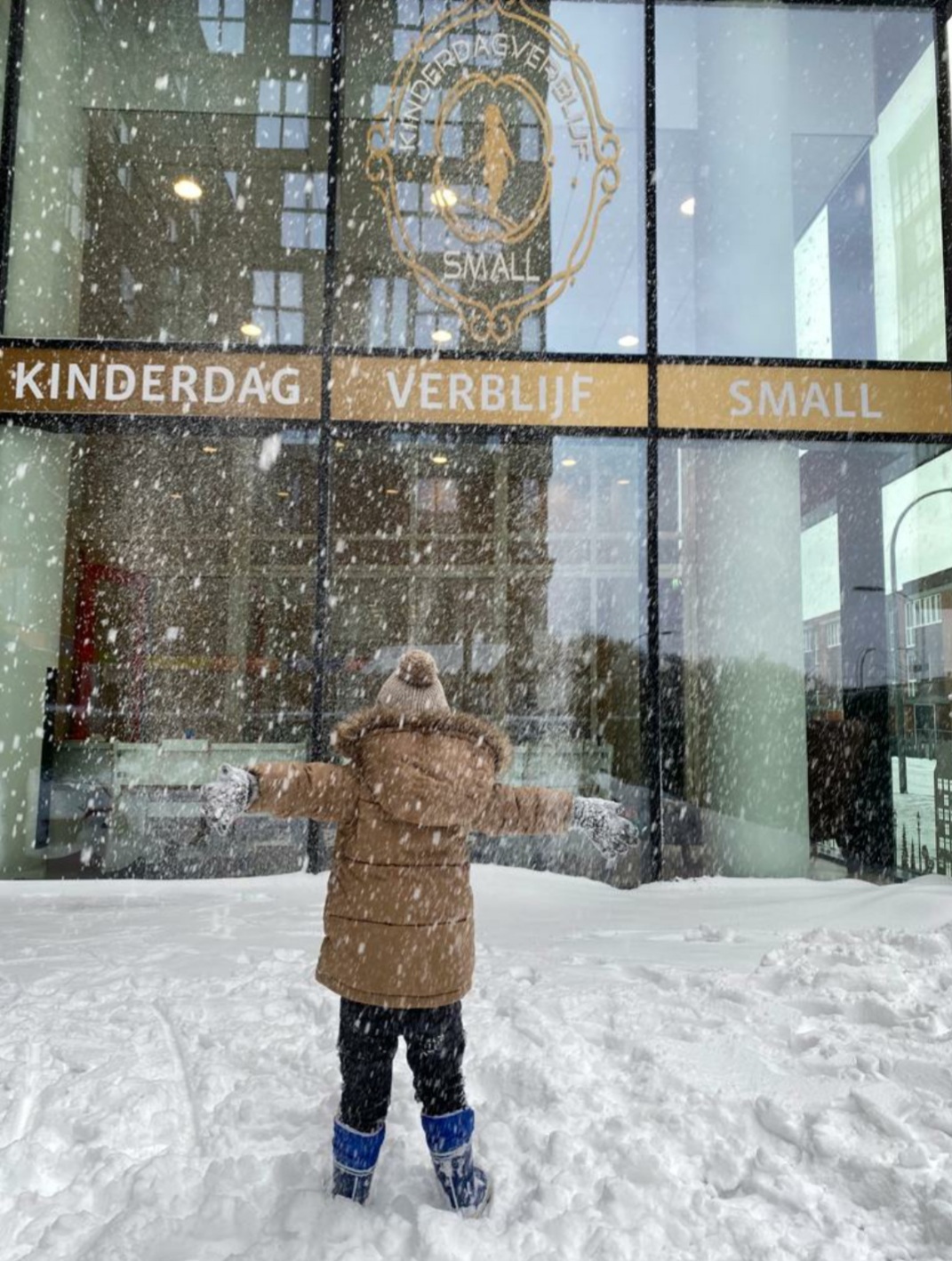 Wat een geweldig gezicht, een grote berg sneeuw voor het kinderdagverblijf. De hele tuin vol met grote heuvels witte sneeuw. Hoe voelt dat ? kunnen we het in de lucht gooien ? We geniet volop met alle kinderen.